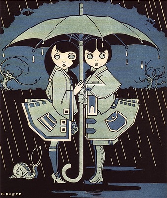 questa illustrazione mi piace tantissimo. dove sono capitate le due? perchè la ragazza di destra pare avere uno sguardo più preoccupato (diciamo in esplorazione dell’antro oscuro) mentre quella di sinistra pare più stia pensanto “oh beh, finalmente qui non ci vede nessuno”? che ce l’abbia attirata lei? e i mostriciattoli lì intorno quanto sono belli? e l’ombrello gigante? e l’abbigliamento? ah che splendore.